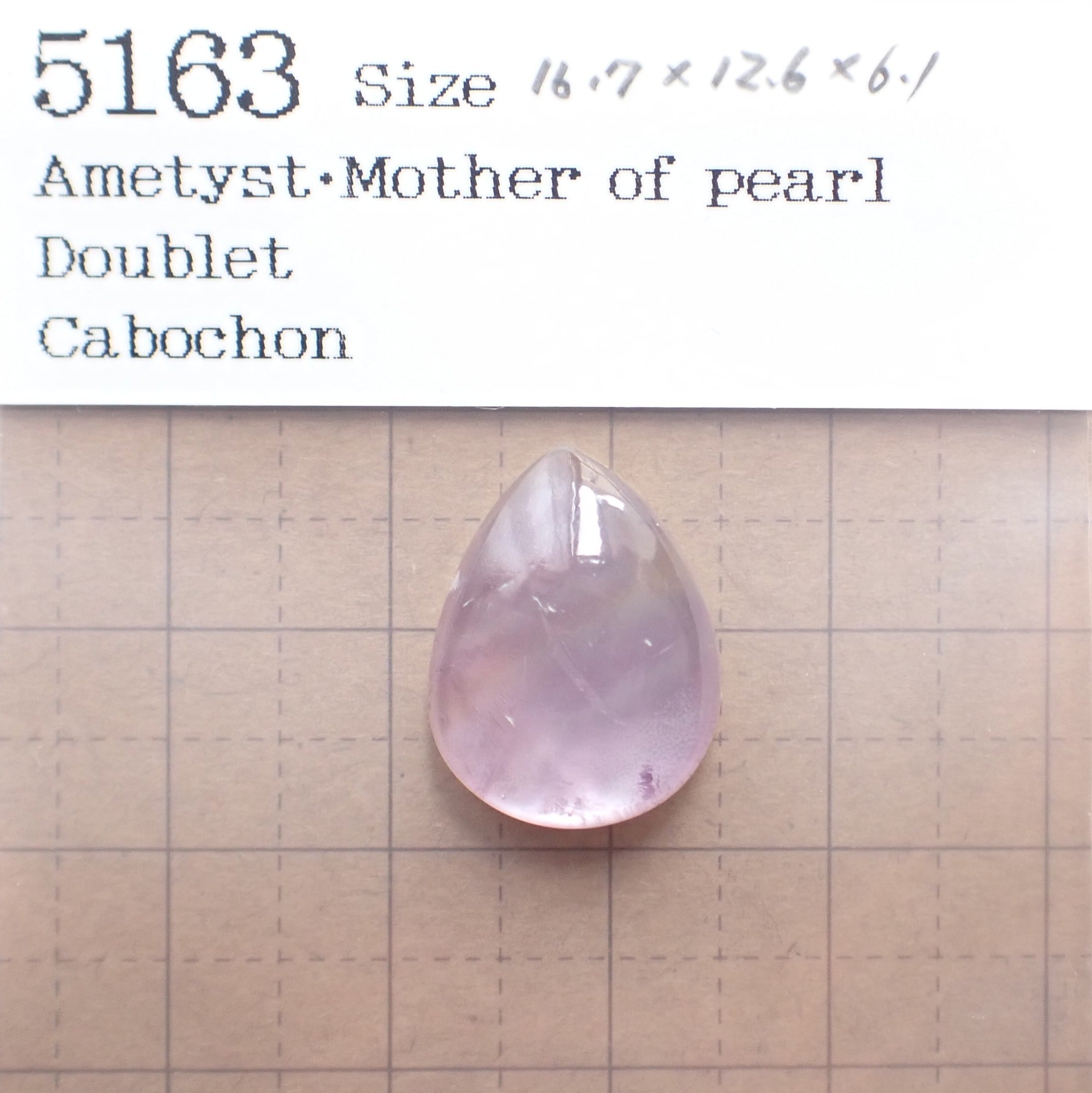 薄くスライスされたマザーオブパールにアメシストを合わせたカボションです。