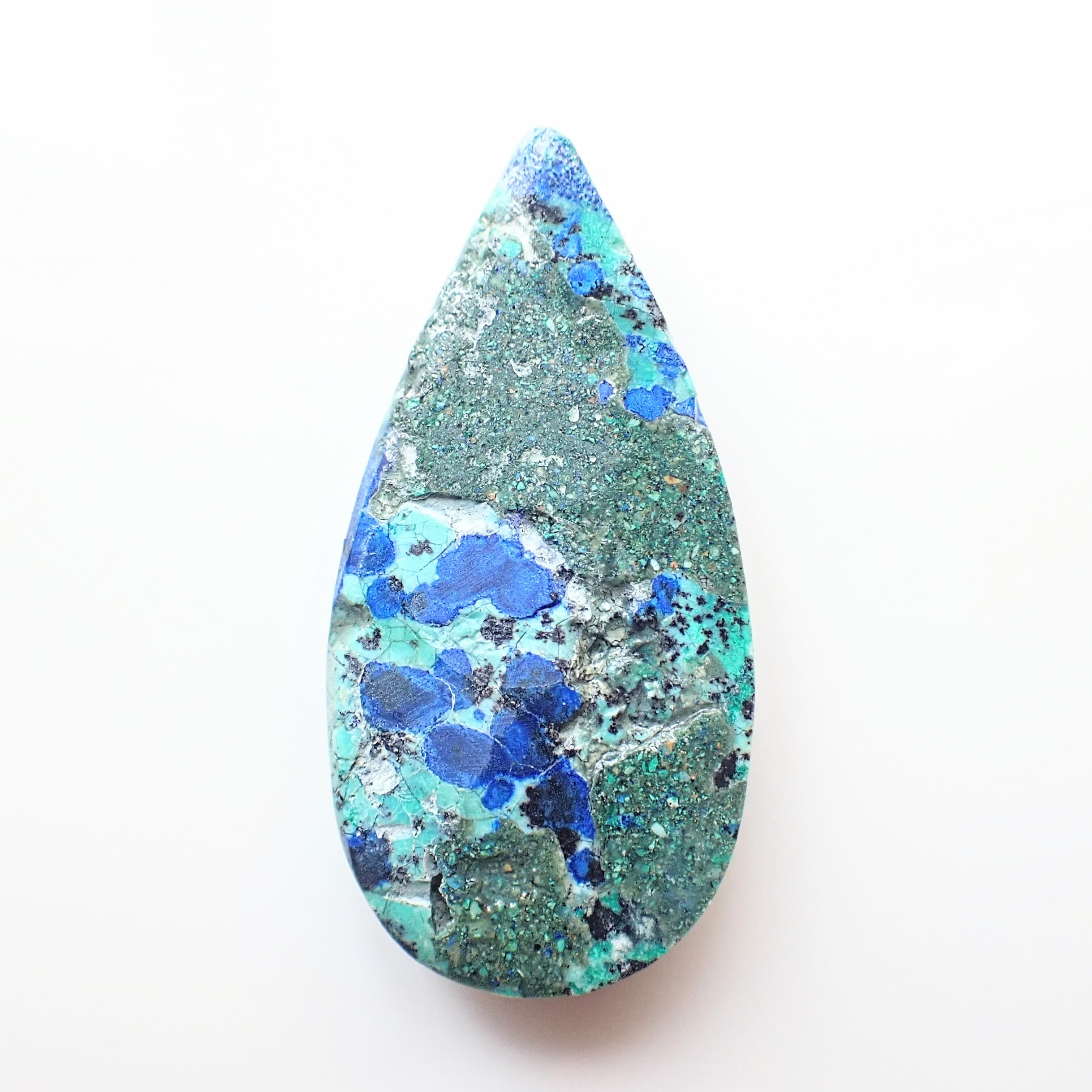 主に濃い青色のアズライトと明るい空色をしたクリソコラなどの混合石です。