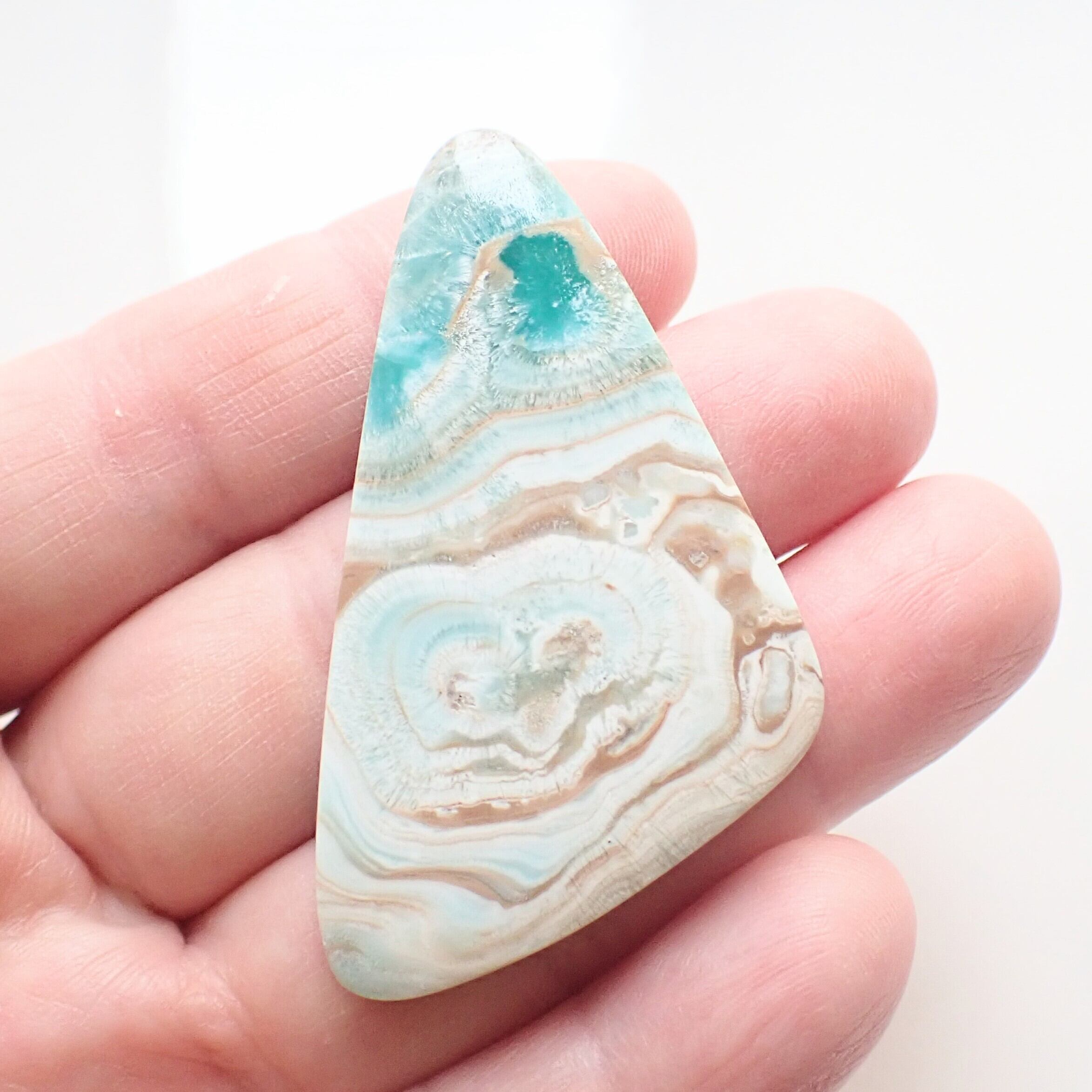 ブルーアラゴナイトはそれほど希少な鉱物という訳ではありませんが、比較的加工品の流通量が少ないせいかルースとしてはレアな部類に入るかもしれません。