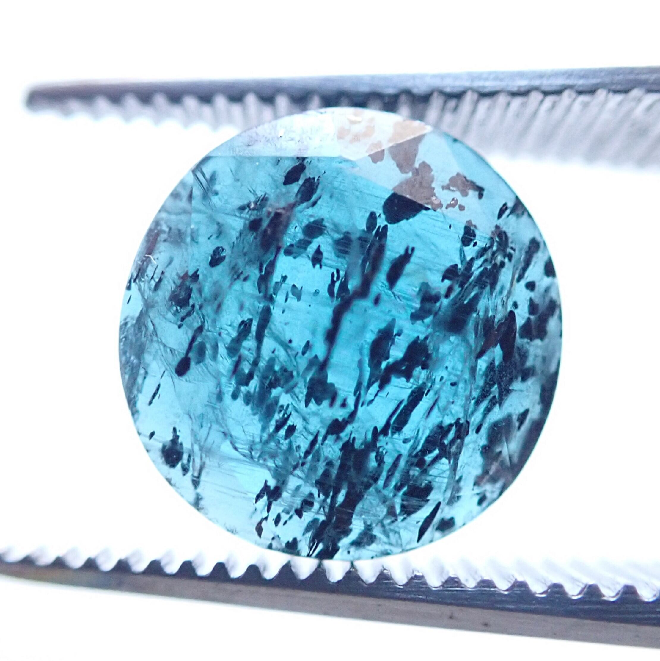 黒いインクルージョンが散りばめられたティールブルーのカイヤナイトです。